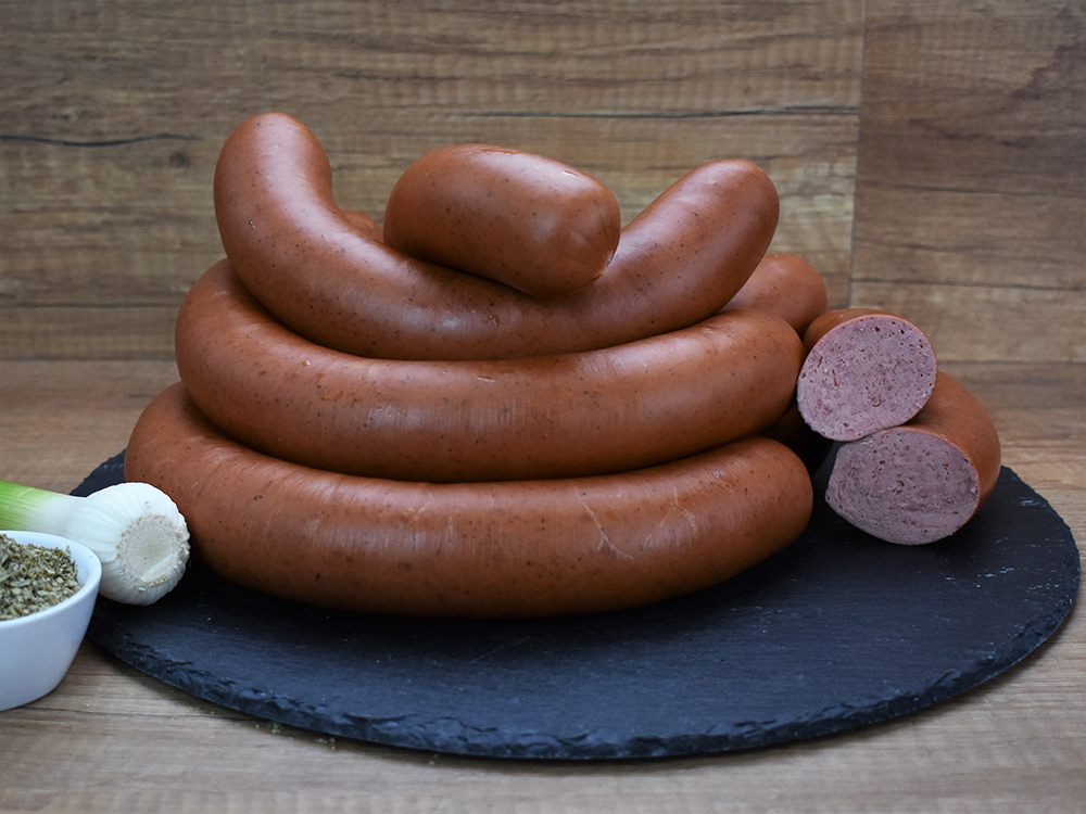 Von der Würzung her eine klassische Fleischwurst mit Knoblauch, bei uns kräftiger gewürzt mit einer dezenten Majoran Note.