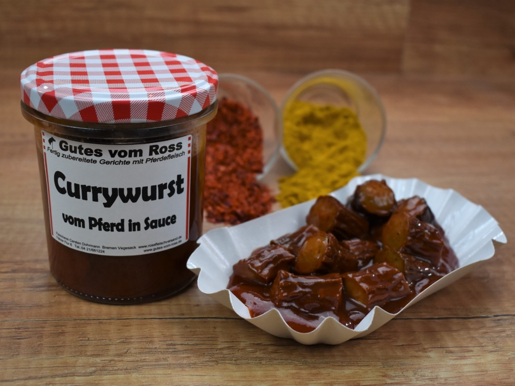 Leckere Wurst aus 100% Pferdefleisch in einer feinen Currysauce.
