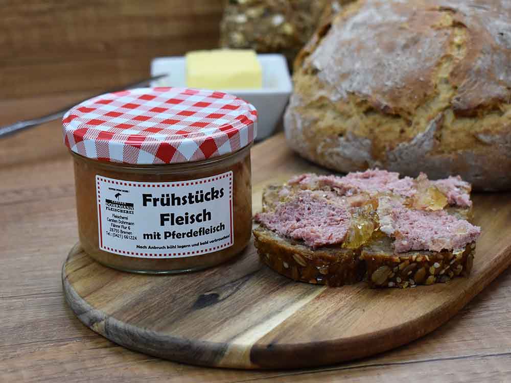 Unser Frühstücksfleisch ist eine unter Verwendung von Pferdefleisch hergestellte Zwiebelwurst im Geleemantel.