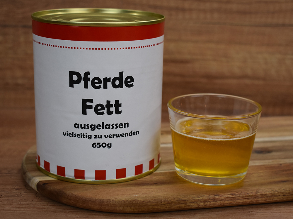 Dieses Pferdefett wurde von uns ausgelassen, gefiltert und dann in einer Dose haltbar gemacht.