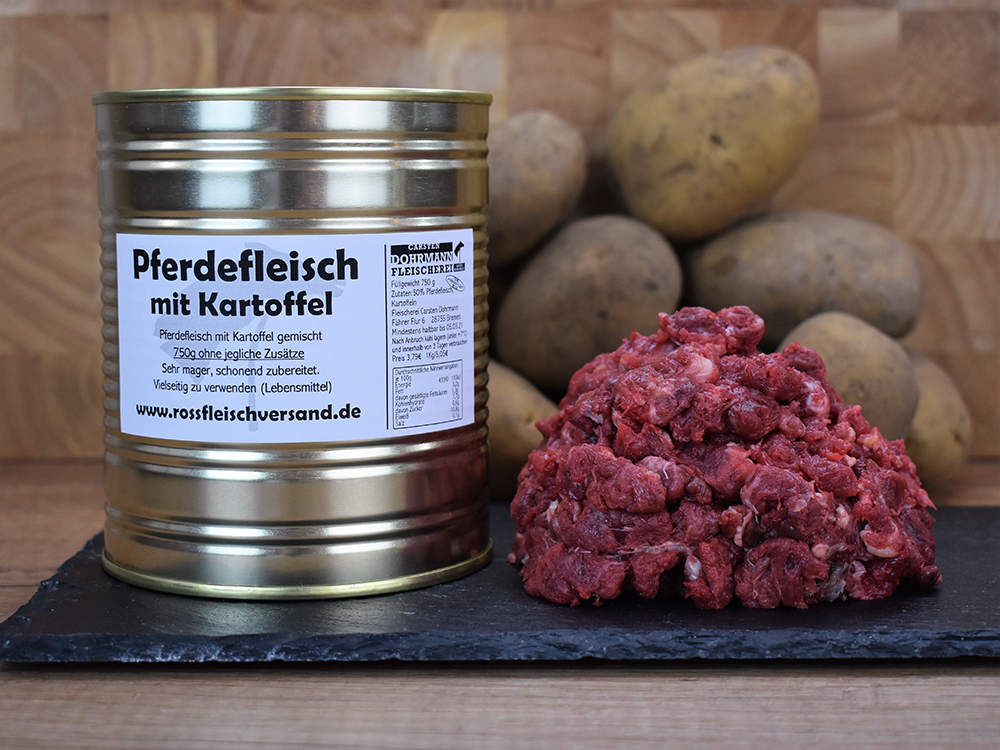Diese Dose enthält 50% Pferdemuskelfleisch und 50% Kartoffeln