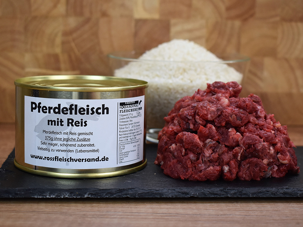Diese Dose enthält 50% Pferdemuskelfleisch und 50% gekochter Reis.