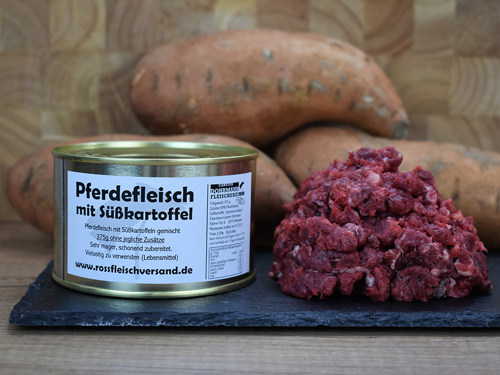50% grob gewolftes Pferdemuskelfleisch und 50% Süßkartoffel sind in dieser Dose.