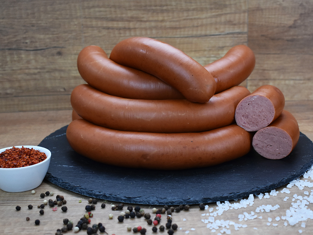 Von der Würzung her eine klassische Fleischwurst, mild gewürzt mit Pfeffer, Paprika und einem Hauch Muskat.