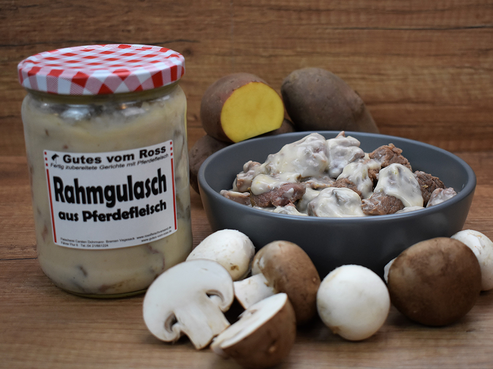 Zartes Pferdefleisch gebraten mit Champignons in einer hellen Sahnesauce.